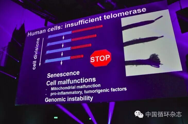 在ESC 2015的主旨演讲中,诺贝尔奖获得者伊丽莎白·布莱克本(LaureateElizabeth Blackburn)指出,端粒与细胞衰老有非常密切的关系,端粒越短,细胞也就越衰老。