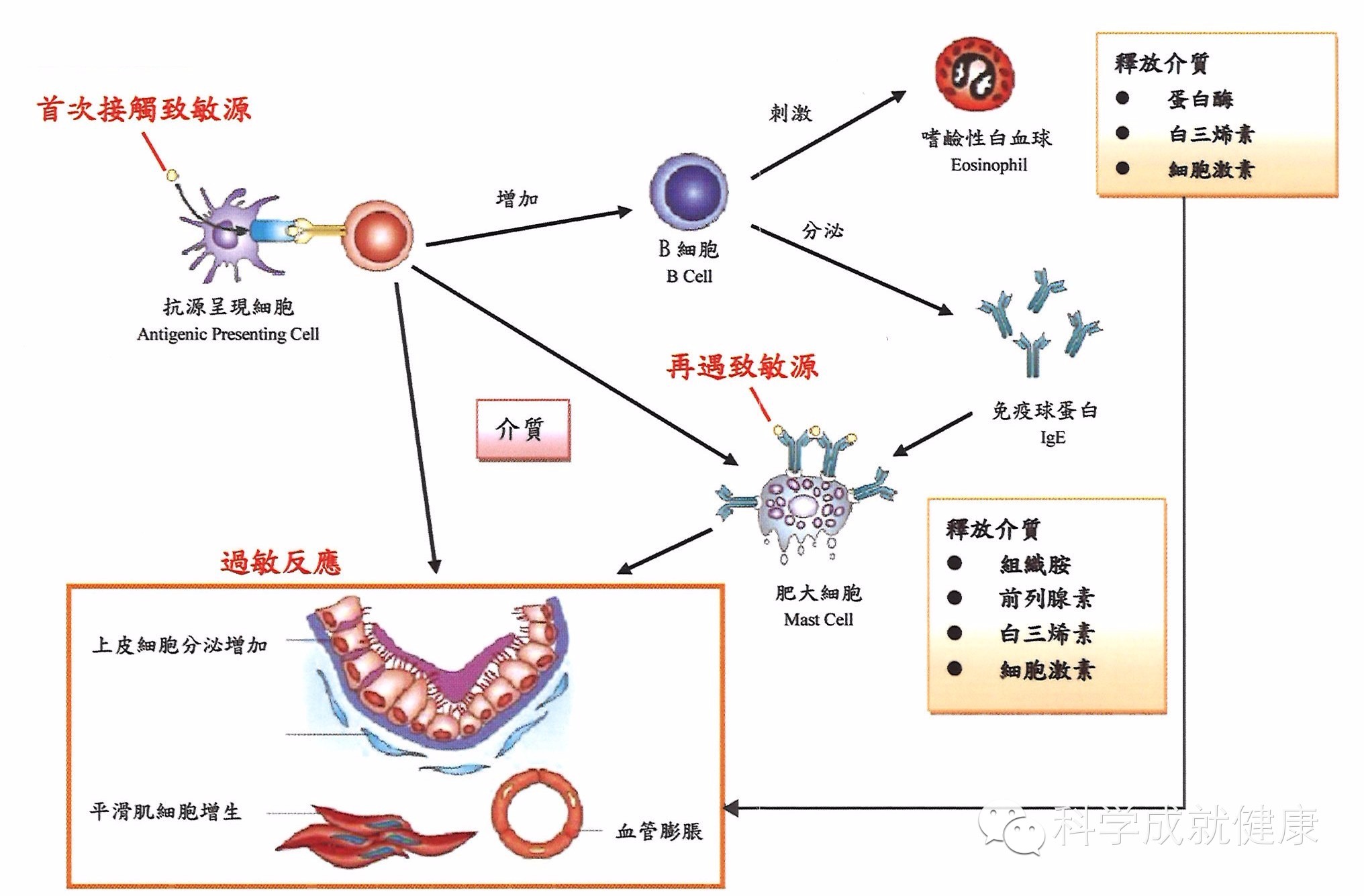 具体来说,过敏就是将外来抗原解读为有害的物体(如细菌、病毒、花粉、灰尘等)而产生变态反应,会使免疫细胞中的吞噬细胞开始活化,释出组织胺与前列腺素,组织胺与前列腺素会使微血管扩张、血管通透性增加、发痒、平滑肌收缩和反射作用等一连串的作用,小则皮肤出现红斑麻疹,重则导致肿胀发热等炎症表征。过敏指的即是这些不正常的免疫反应对自己正常的自体组织产生伤害。严重的过敏症状可能引起死亡。病理基础是血管扩张和通透性增加导致血管容量大幅度增加,而血液本身的量并没有增加,导致了血压急速降低,直到无法维持生命的低血压状态。